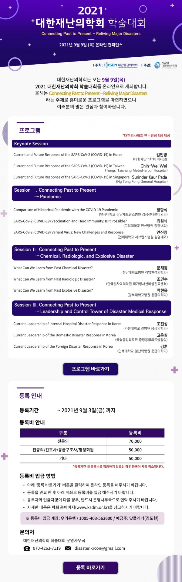 * 문의처 : 대한재난의학회 학술대회 운영사무국(disaster.krcon@gmail.com)
